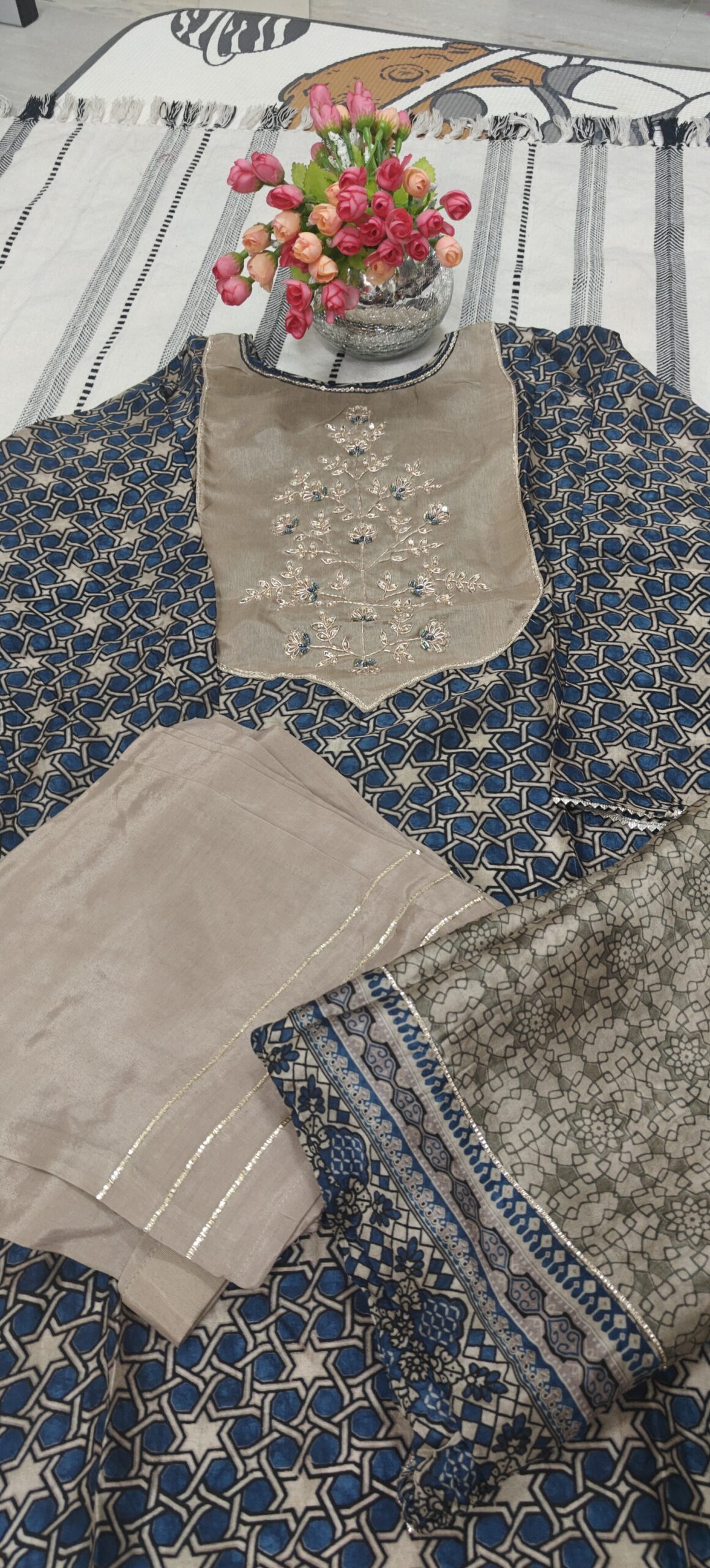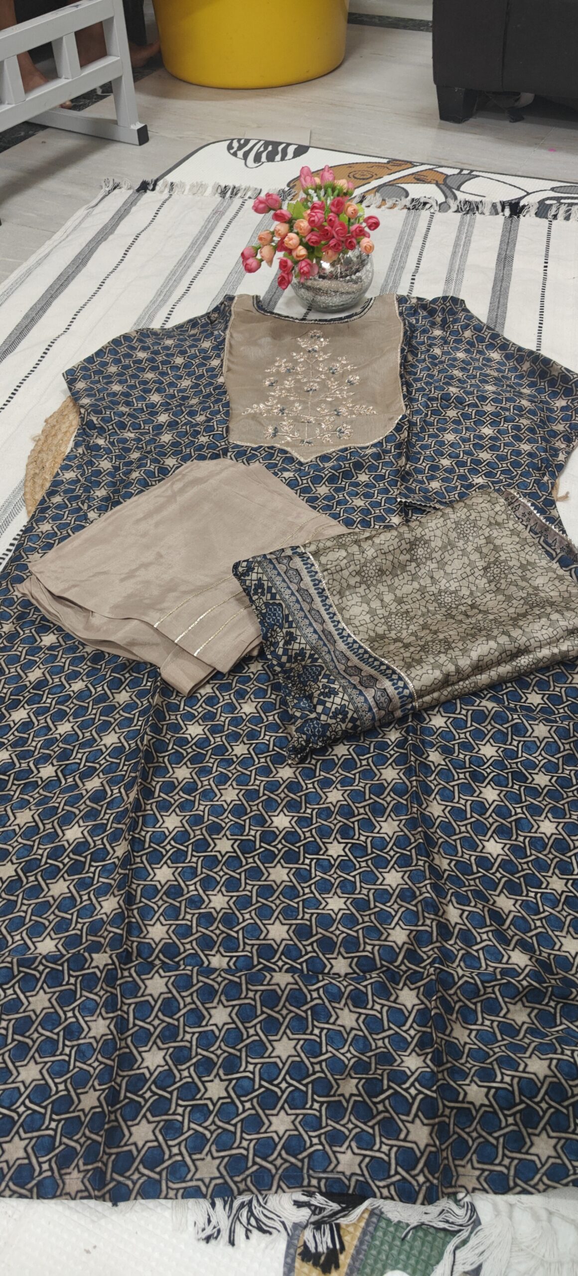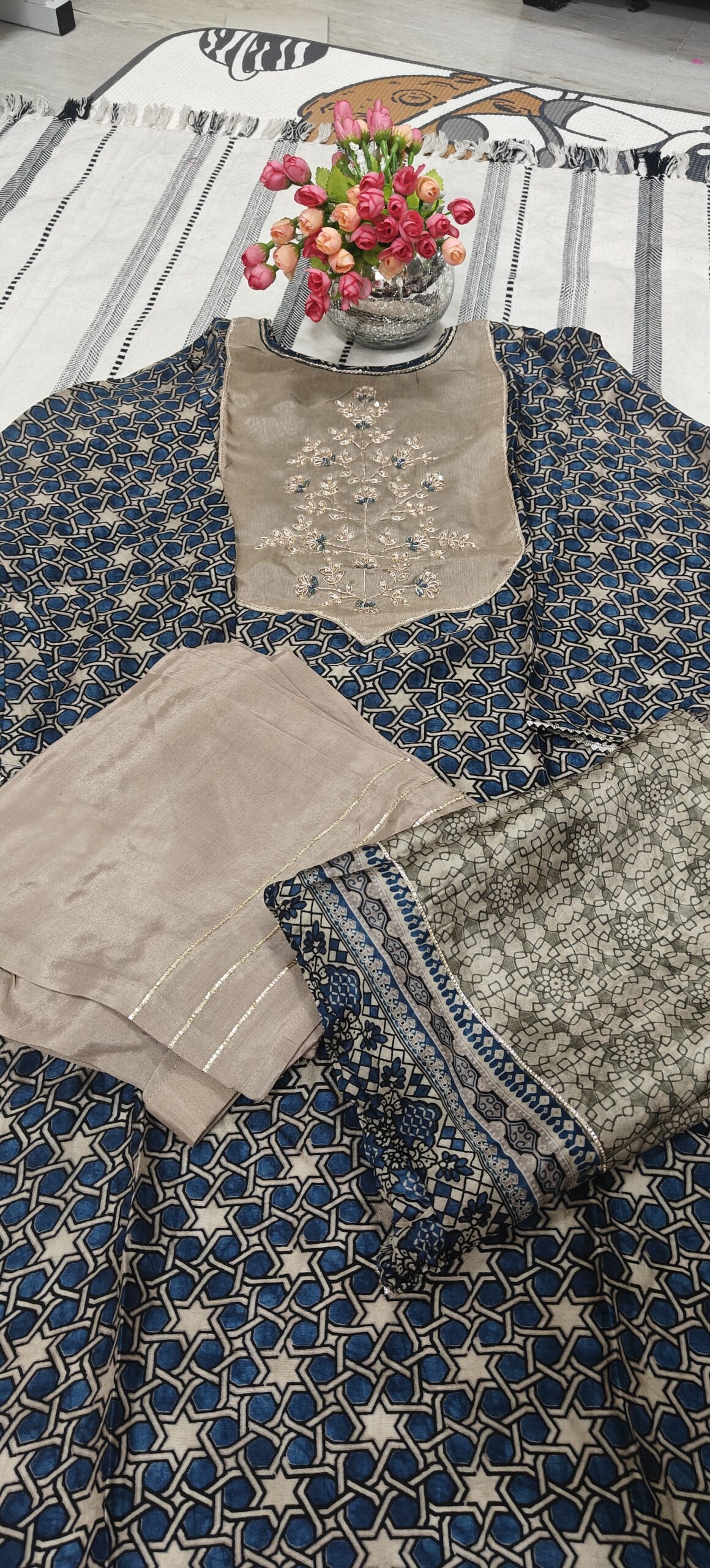 - Beautiful blue geometric printed kurta paired with a soft beige embroidered yoke that adds a rich and graceful look. The delicate thread embroidery with subtle blue highlights gives it a festive charm.