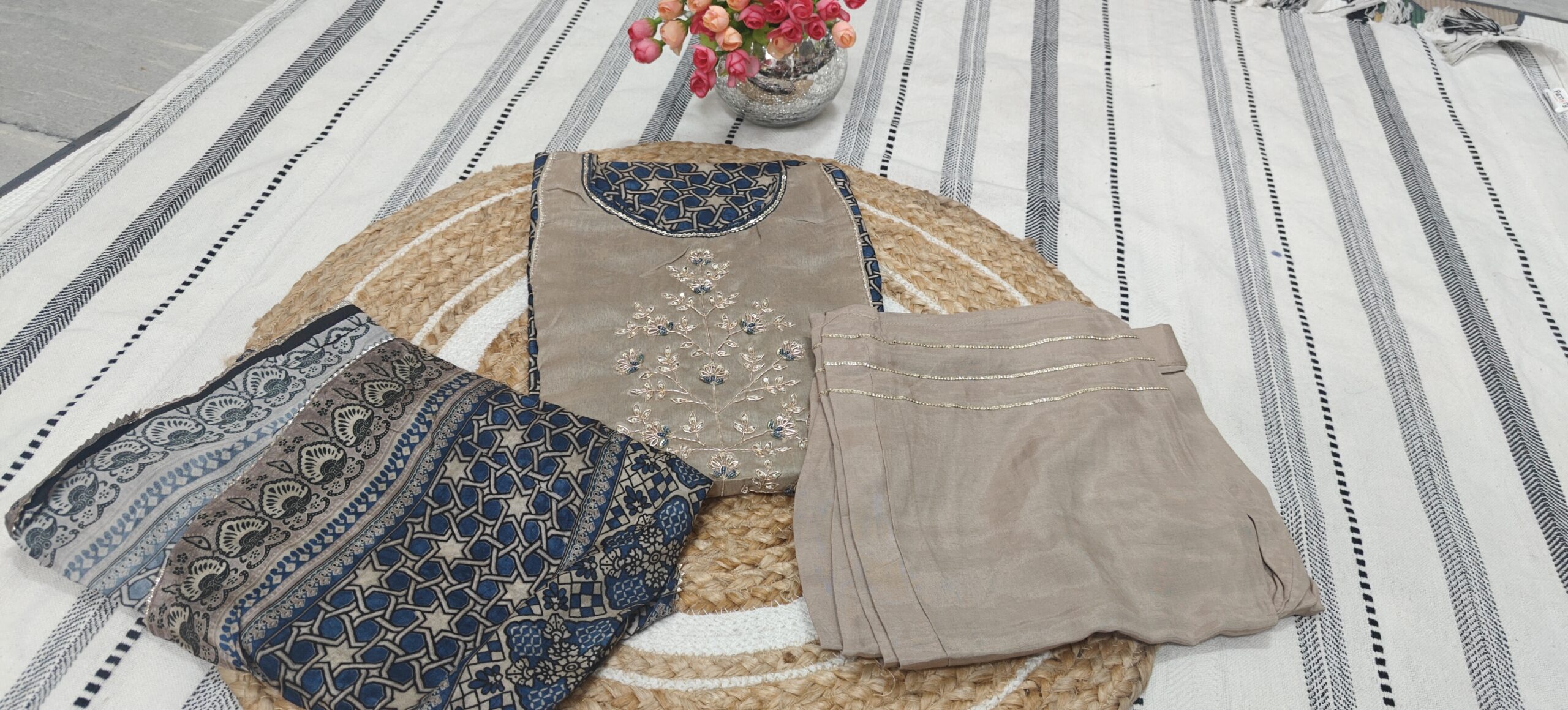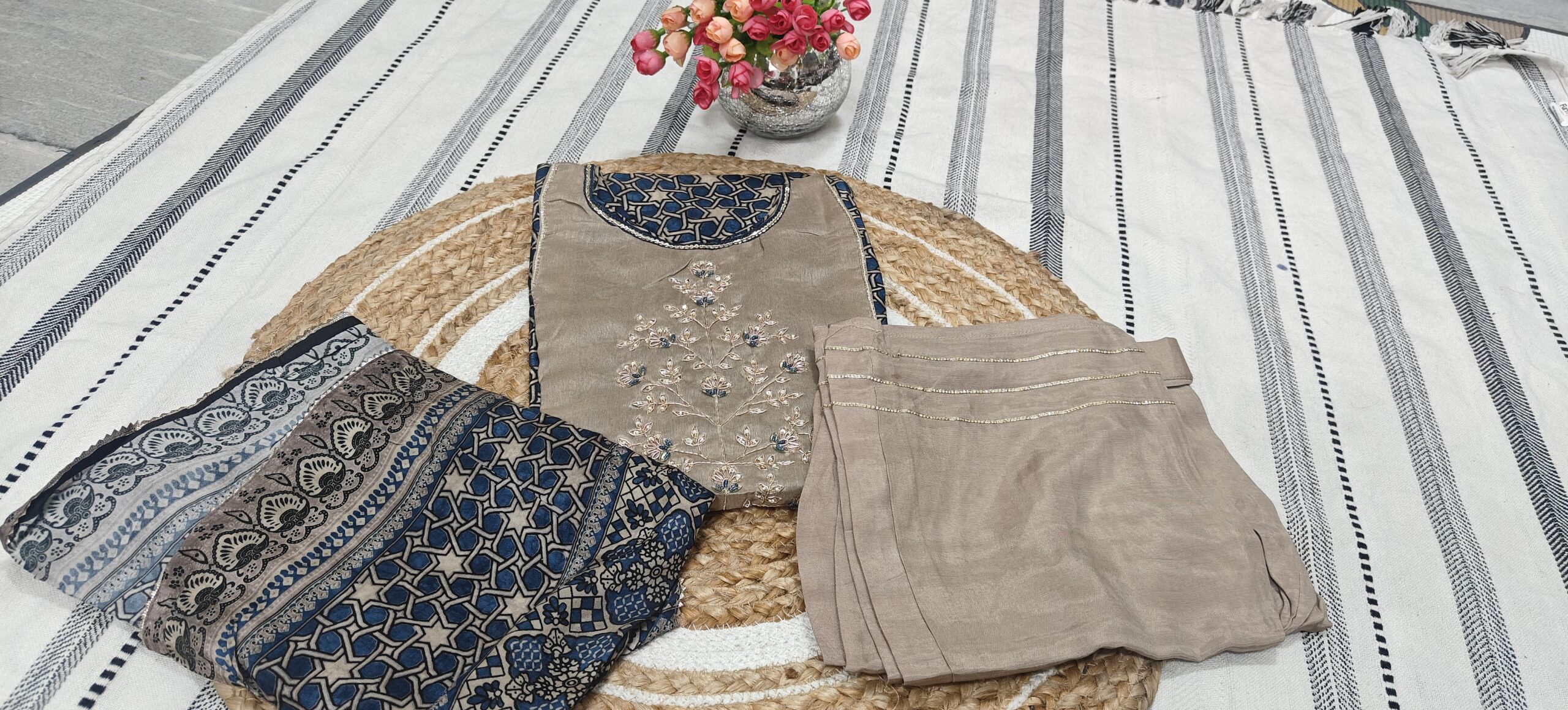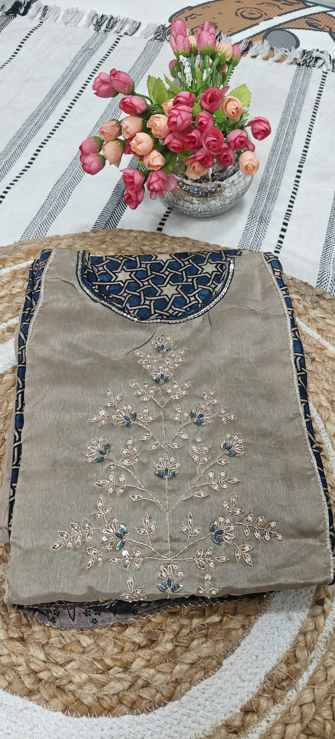 - Beautiful blue geometric printed kurta paired with a soft beige embroidered yoke that adds a rich and graceful look. The delicate thread embroidery with subtle blue highlights gives it a festive charm.