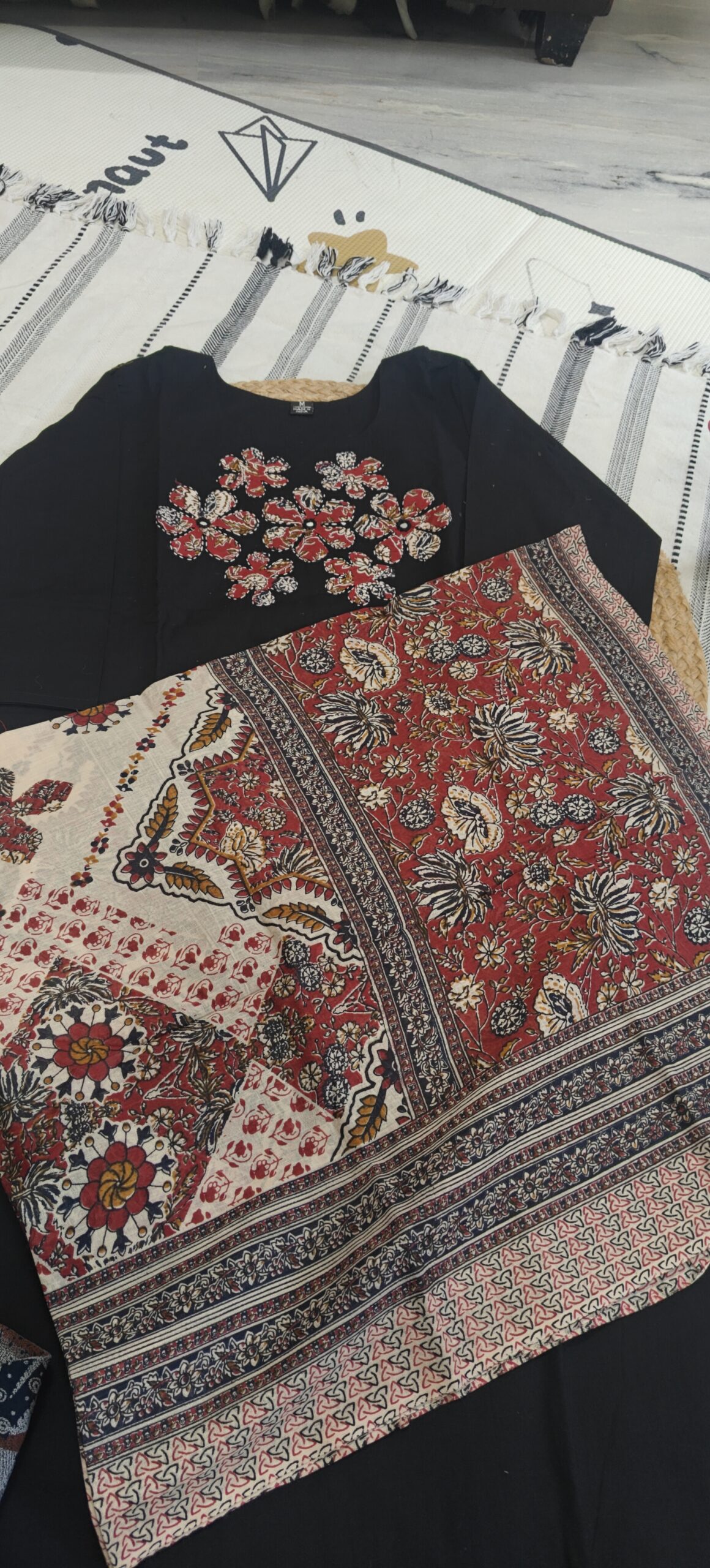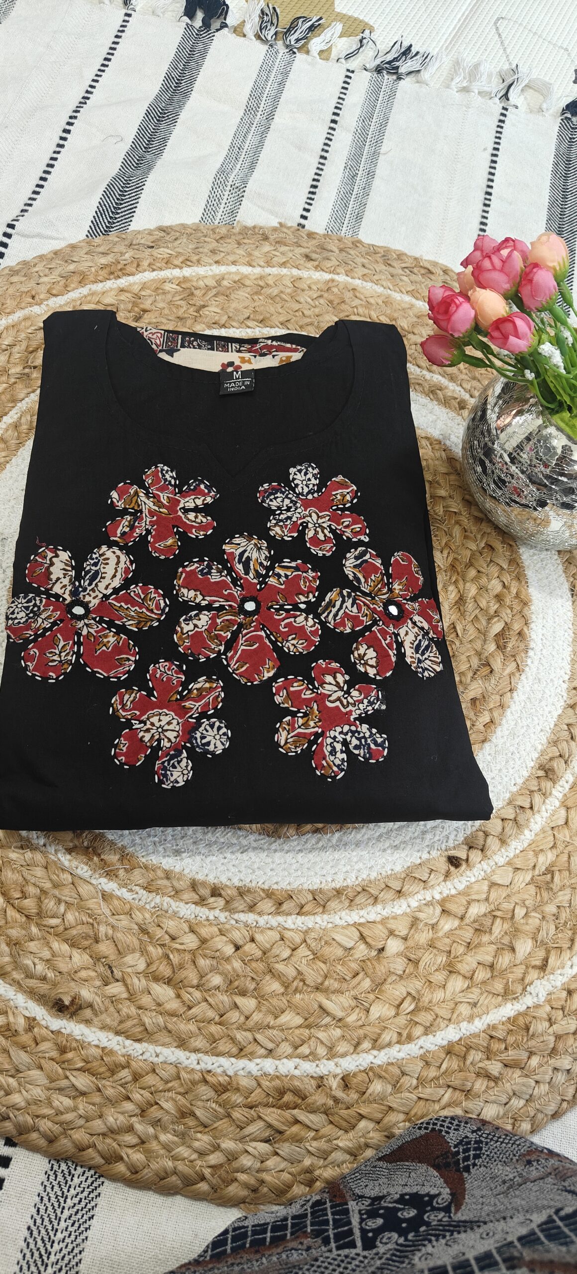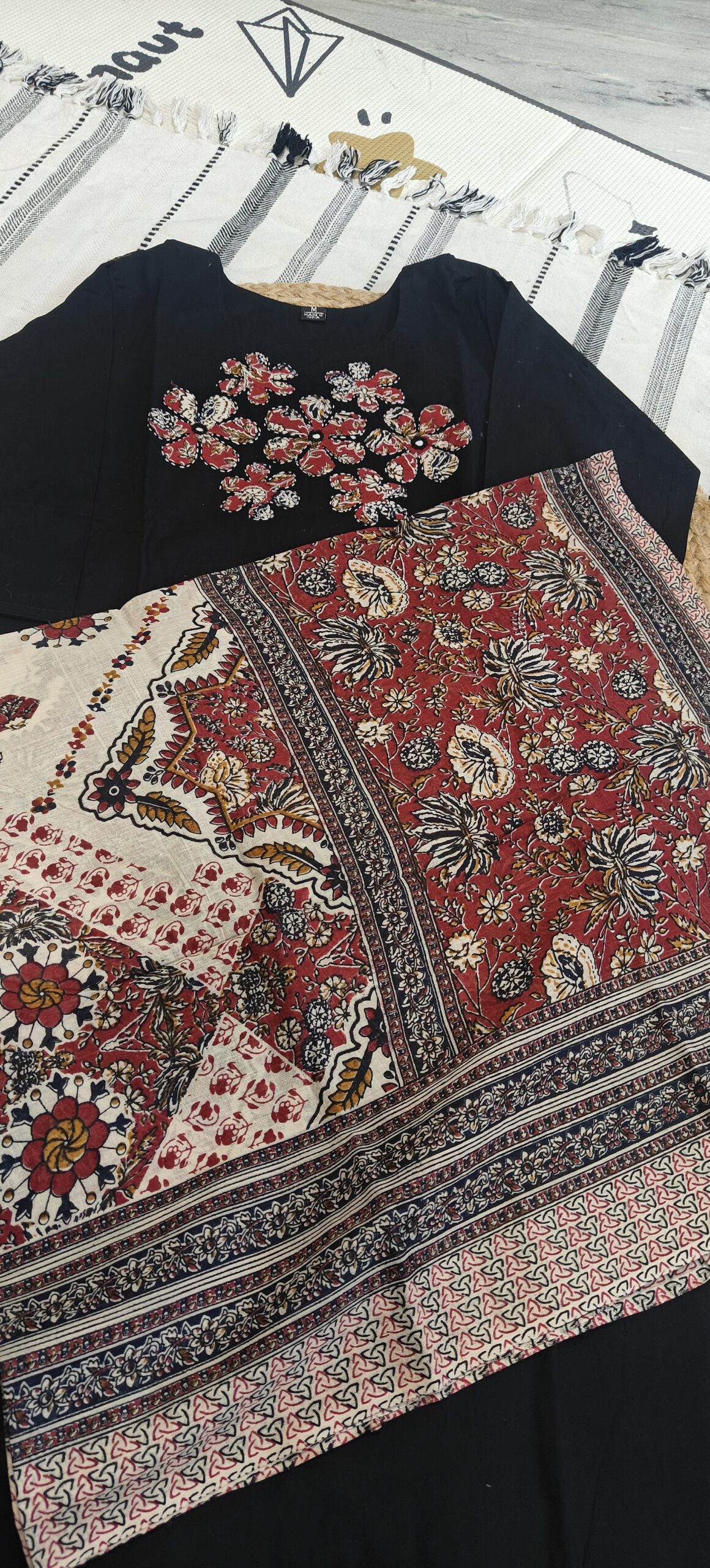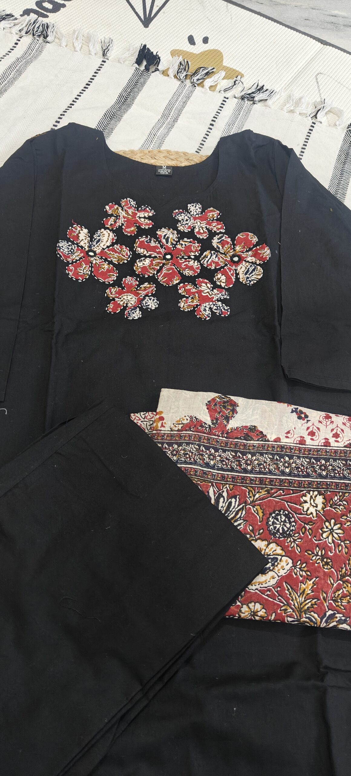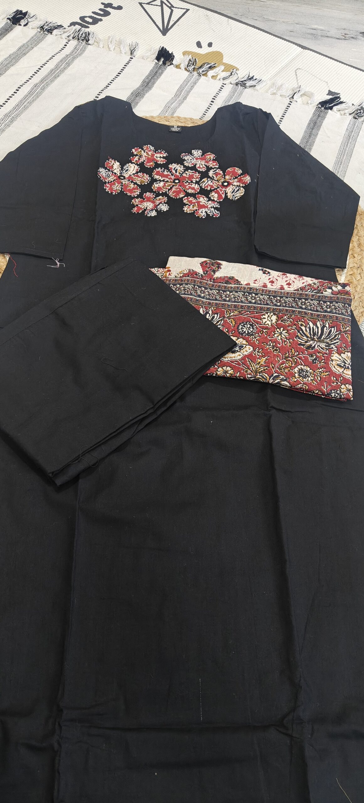 Be the first to review “Black cotton kurta set with patch work at yoke part”