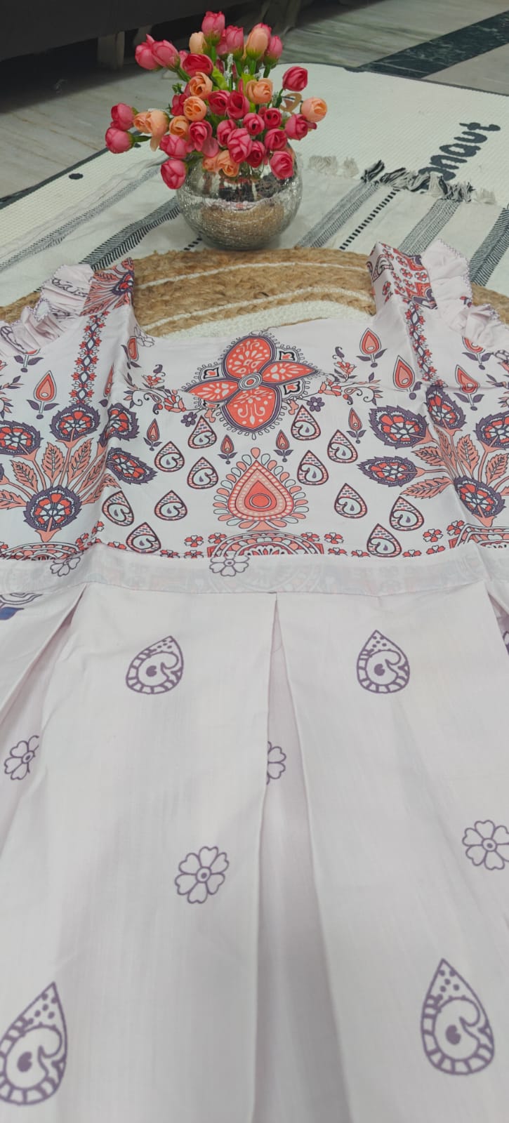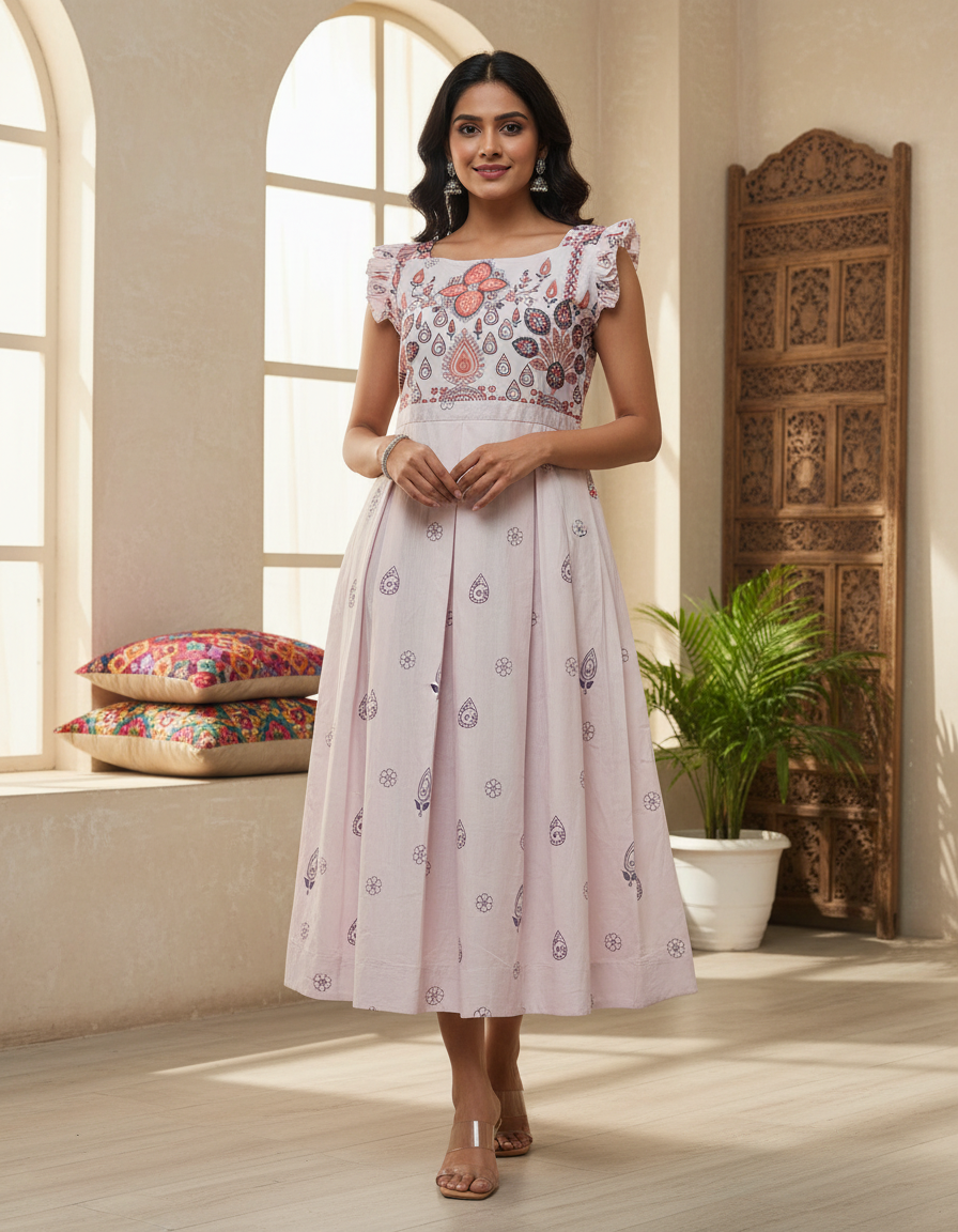Step into effortless elegance with this beautifully designed pastel Anarkali-style frock. Featuring a delicate paisley printed yoke and soft flowing silhouette, this piece blends comfort with festive charm.