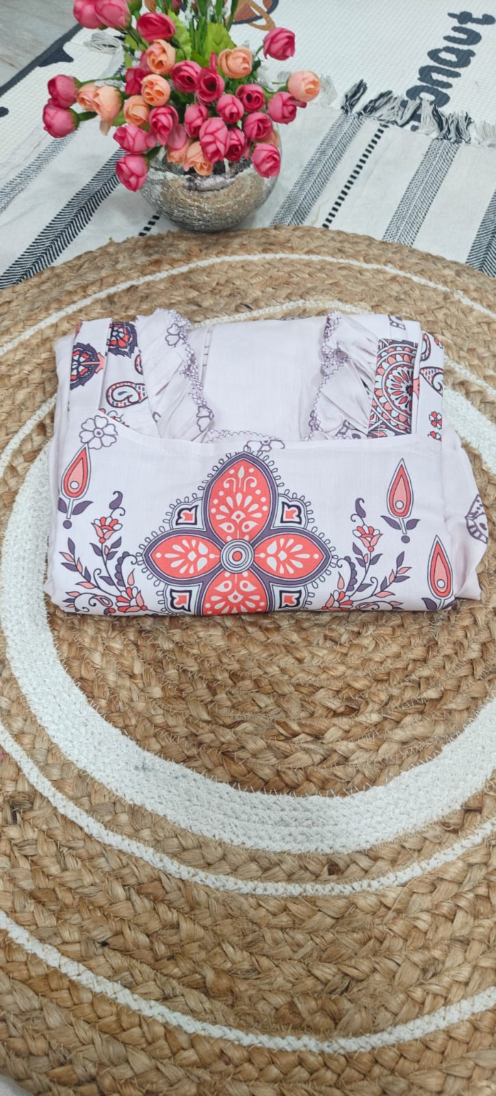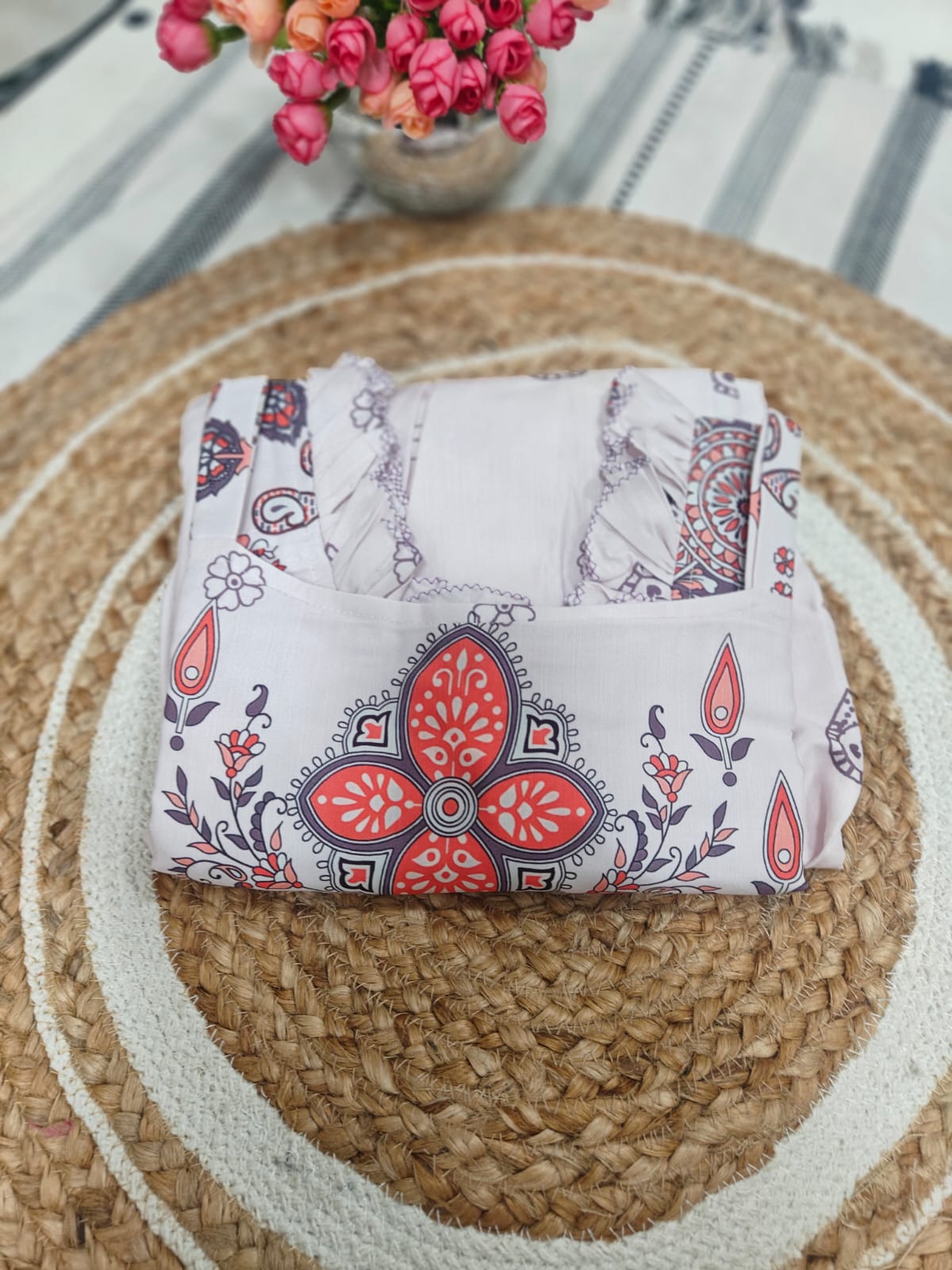 Perfect for Ugadi celebrations, poojas, and daytime gatherings, this outfit gives you a graceful ethnic look without feeling heavy. The lightweight fabric ensures all-day comfort while the subtle prints add a refined touch.