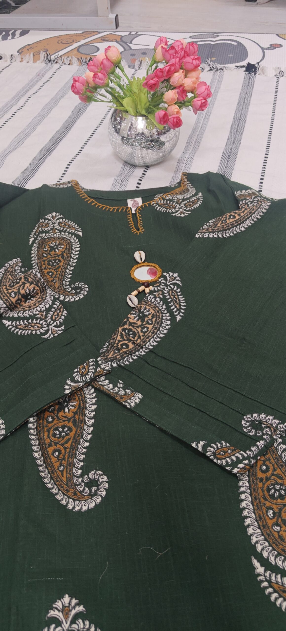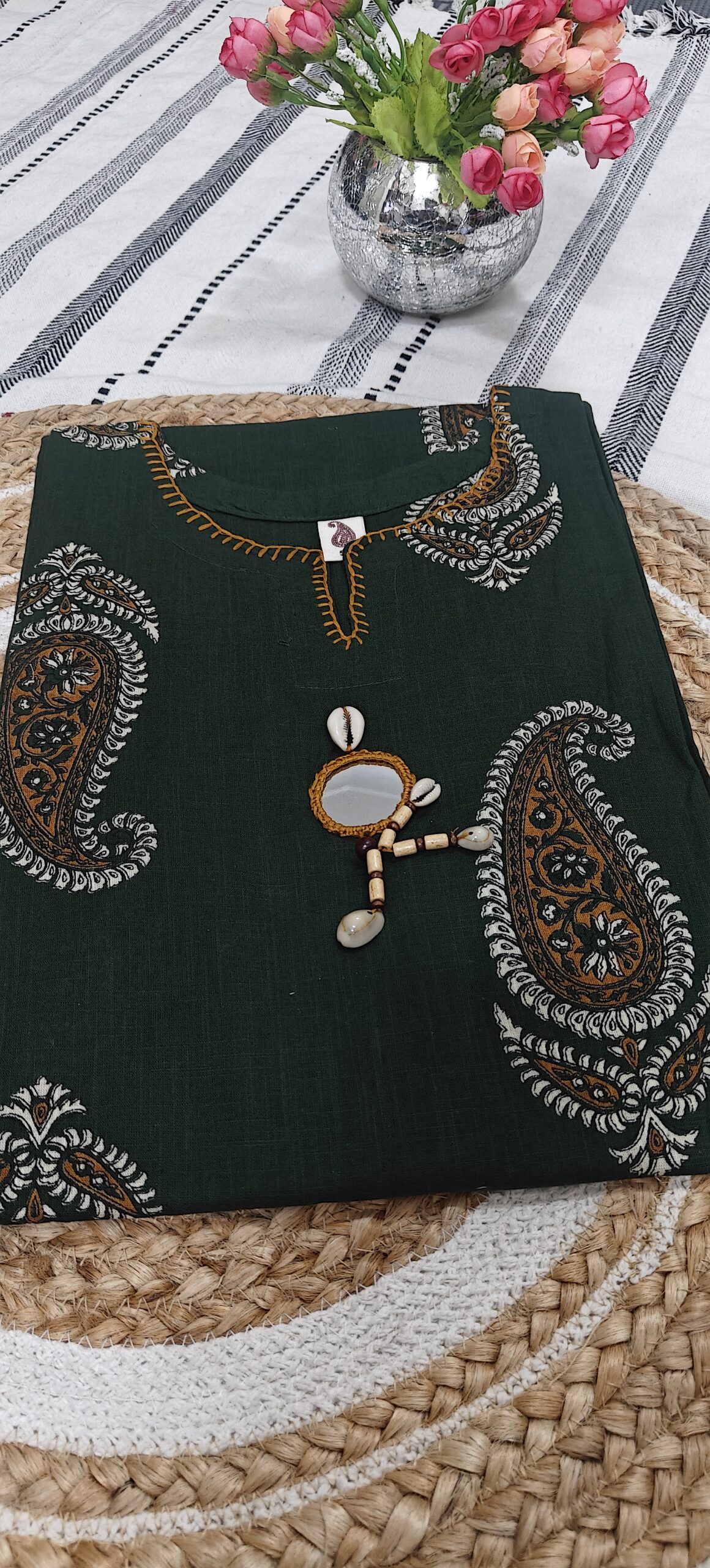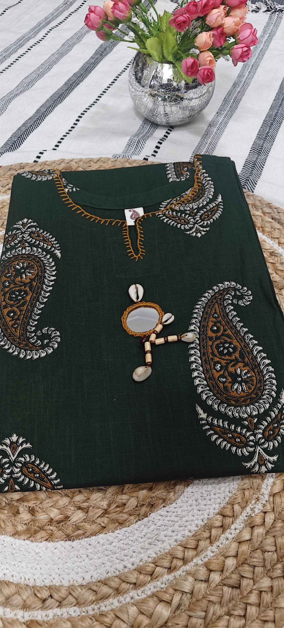 Elevate your everyday style with this elegant emerald green A-line kurta, adorned with classic paisley prints in earthy tones. The beautifully detailed neckline with contrast stitching and handcrafted tassel adds a unique ethnic touch to the outfit.