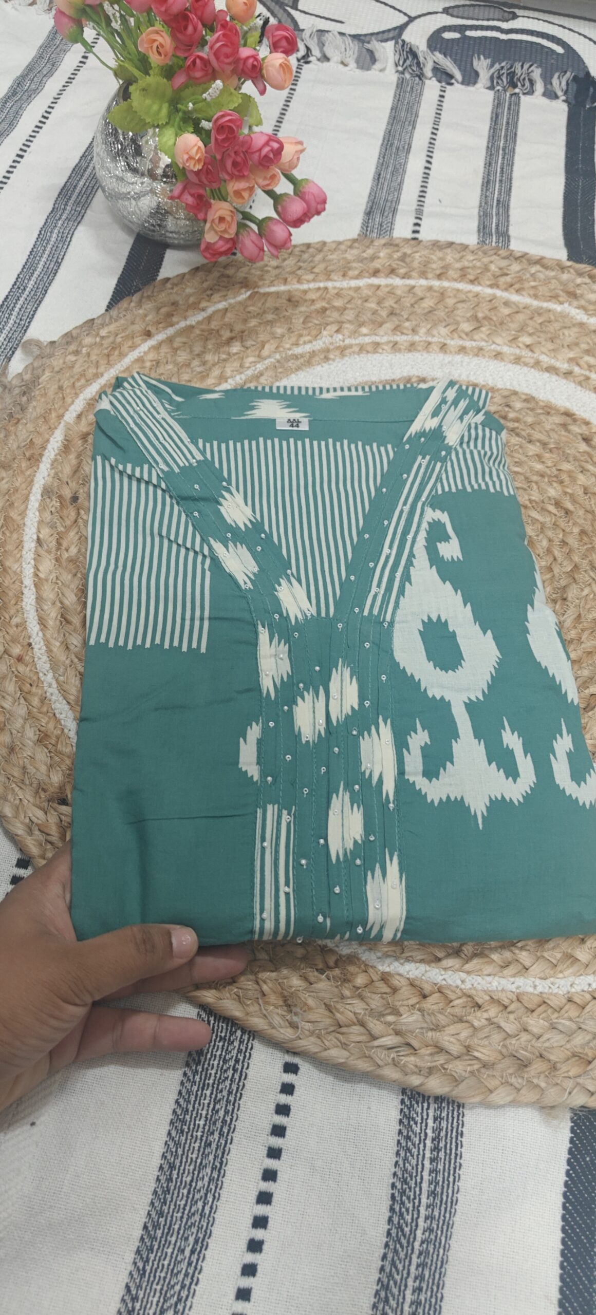 The V-neckline is enhanced with subtle embellishments, adding a touch of sophistication without being too heavy. Crafted from breathable cotton fabric, this kurta ensures all-day comfort, making it ideal for office wear, casual outings, or daily use.