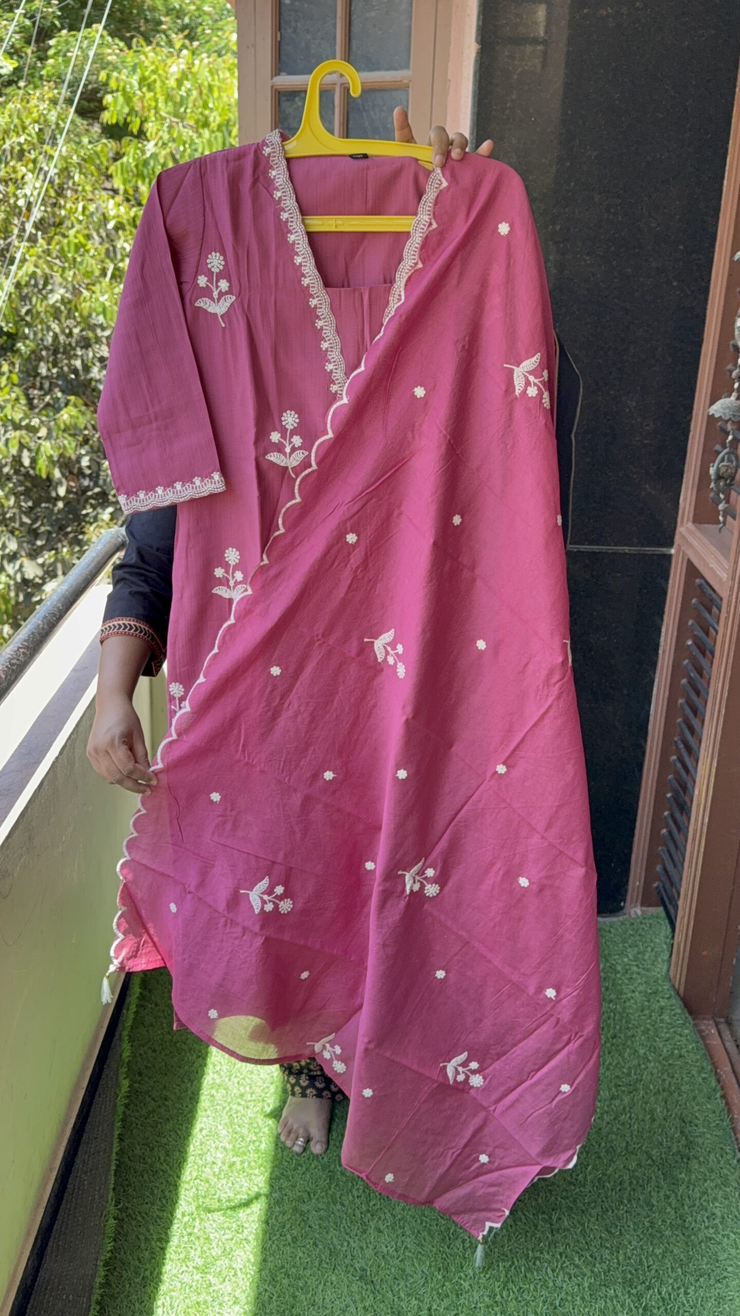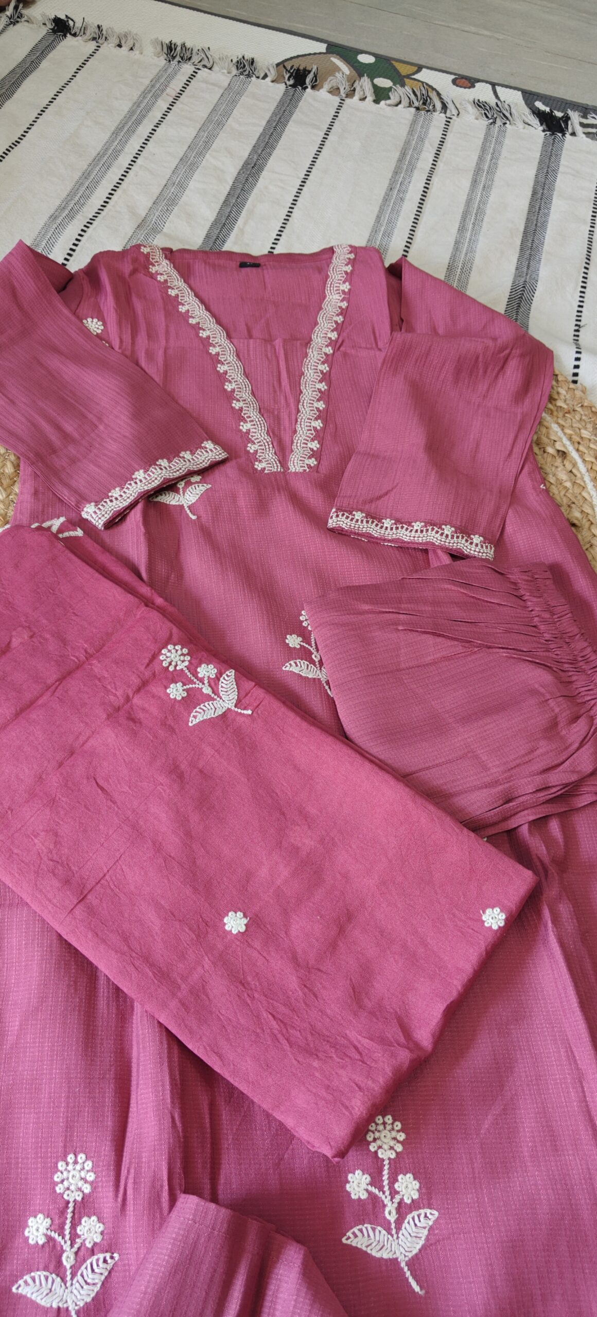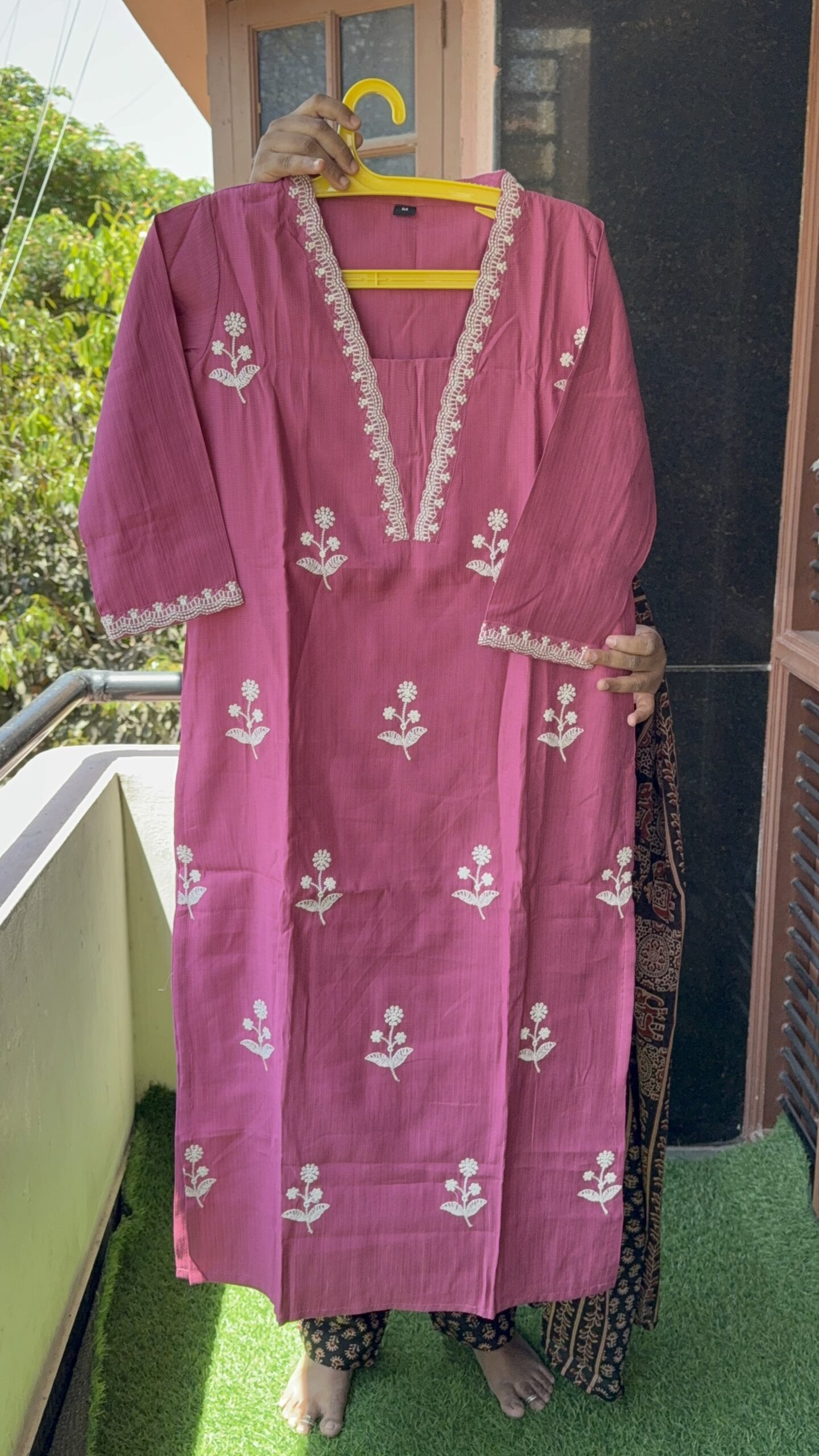 Add elegance to your ethnic wardrobe with this beautiful Heavy Rayon Mixed Cotton Kurta Set in a lovely rose pink shade. The kurta features delicate white floral embroidery motifs all over, giving it a graceful and minimal look.