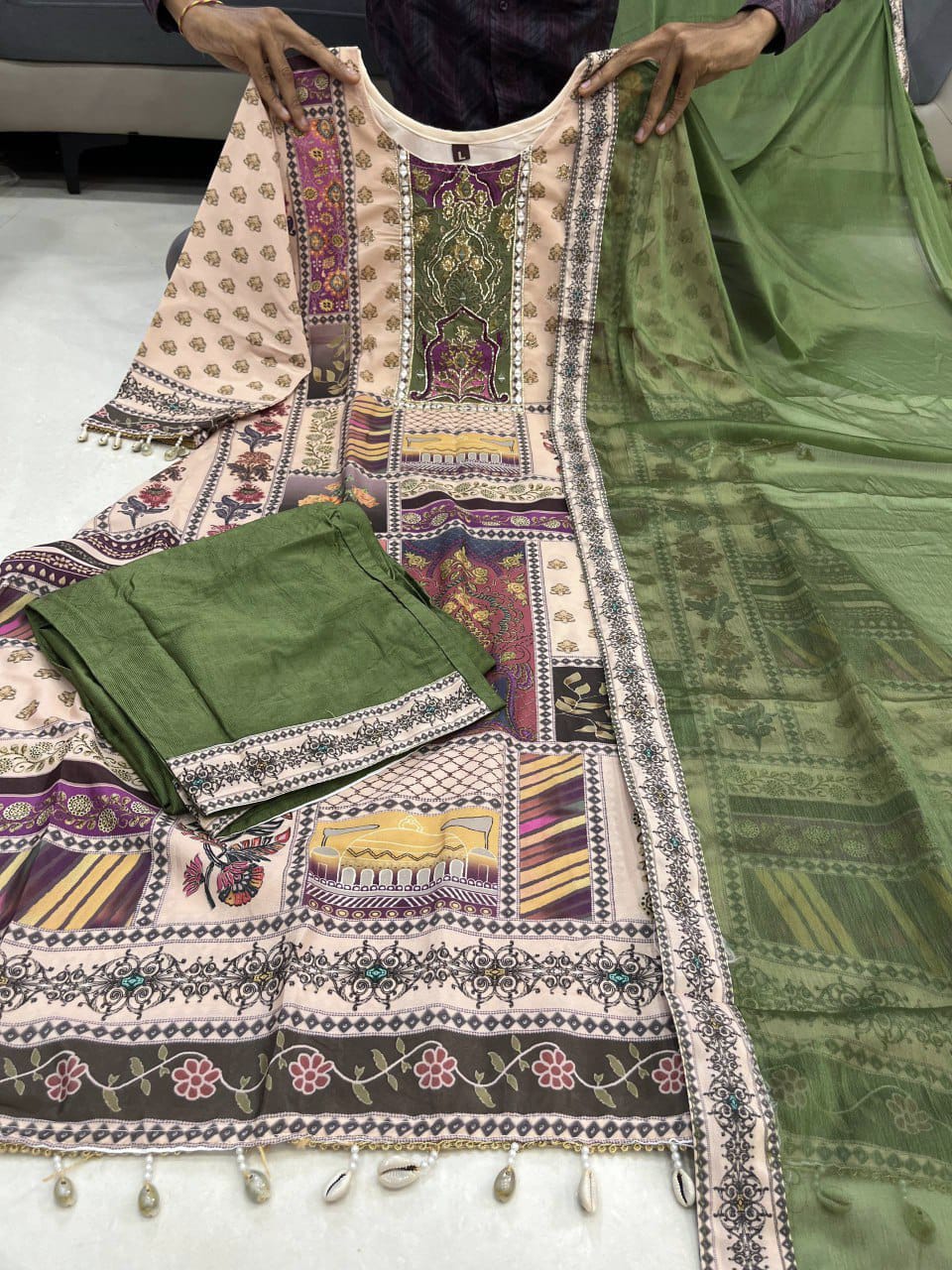 Elevate your everyday elegance with this beautifully crafted A-line kurta in luxurious chinnon fabric. Designed with a rich patchwork-inspired print featuring intricate motifs and heritage patterns, this piece brings together tradition and modern grace. The soft, flowy texture of chinnon ensures a flattering fall, while the detailed sleeves and neckline add a refined touch. Perfect for festive gatherings, office wear, or casual outings where you want to stand out effortlessly.