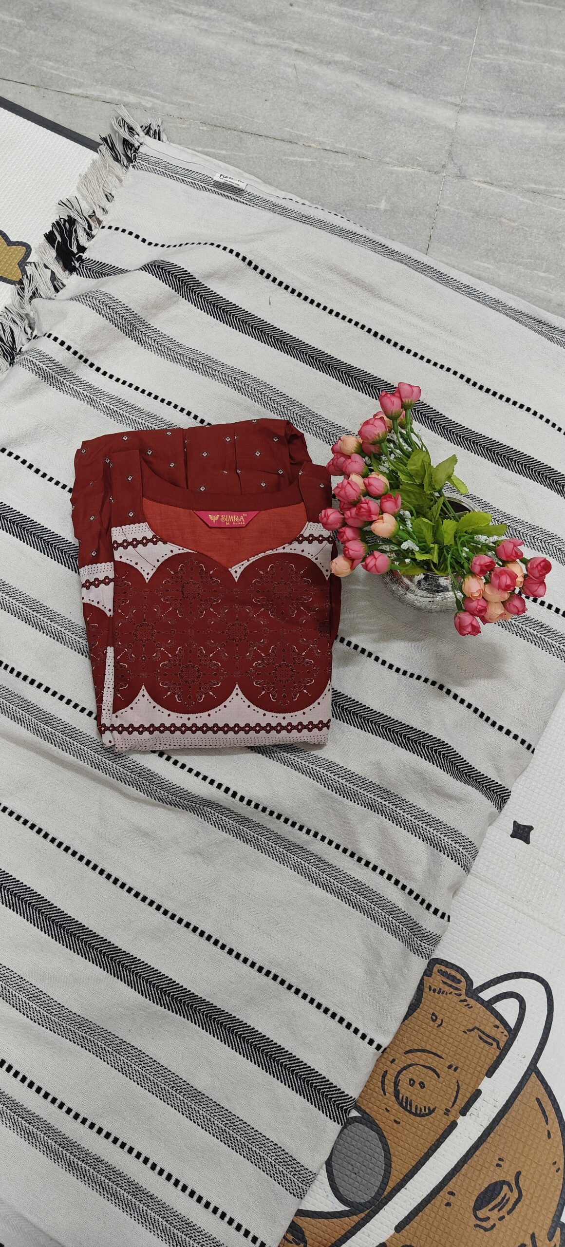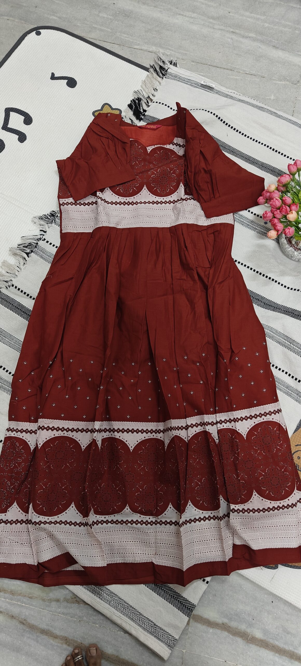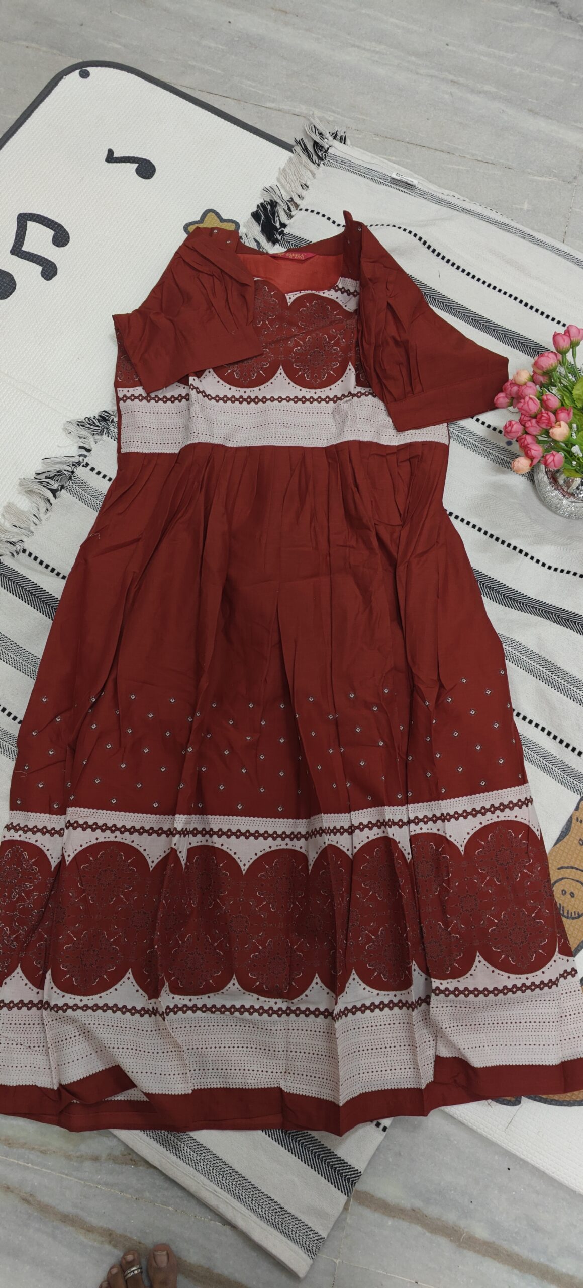 Make a bold yet elegant statement with this stunning ruby red cotton frock, designed with beautiful traditional prints and intricate detailing. The yoke features delicate embellishments, while the contrast white printed panels add a graceful ethnic touch.
