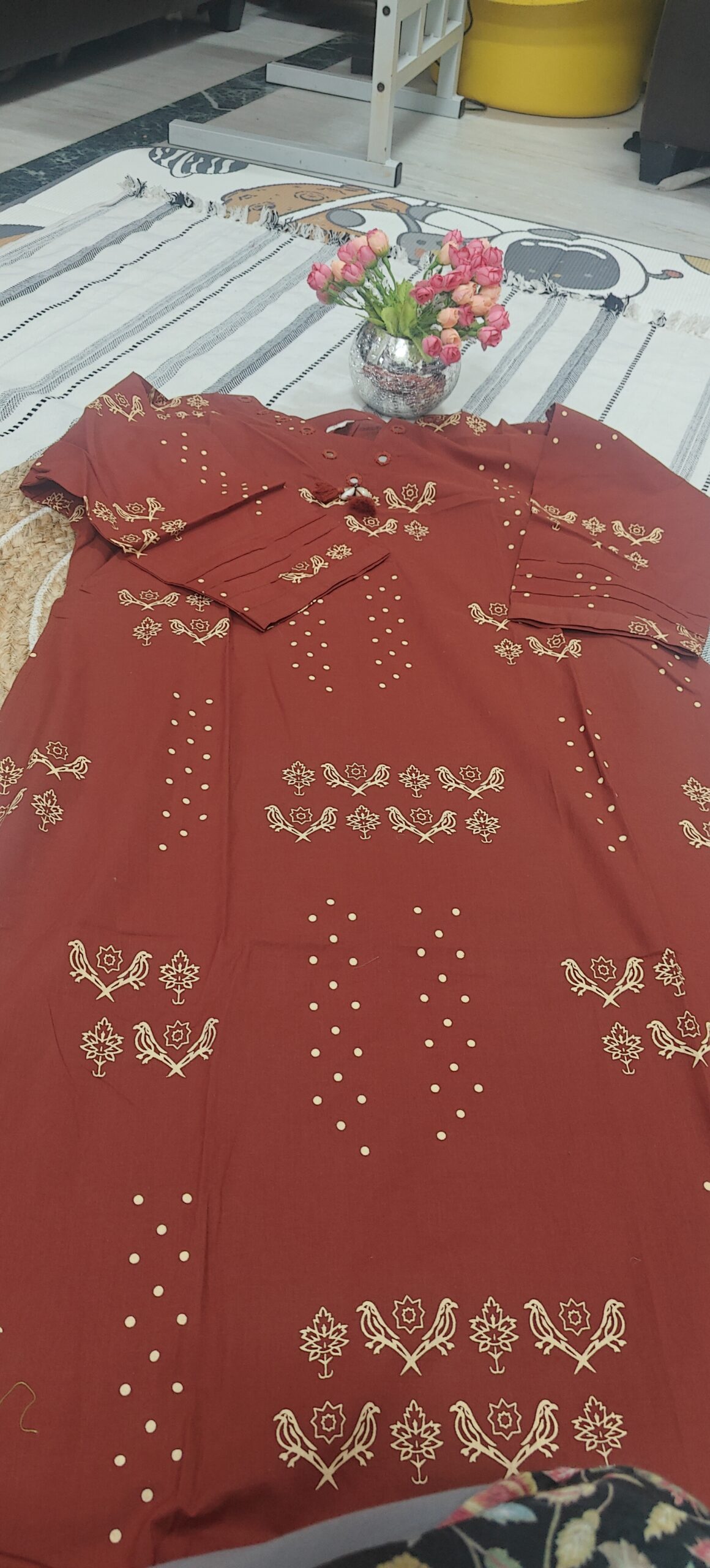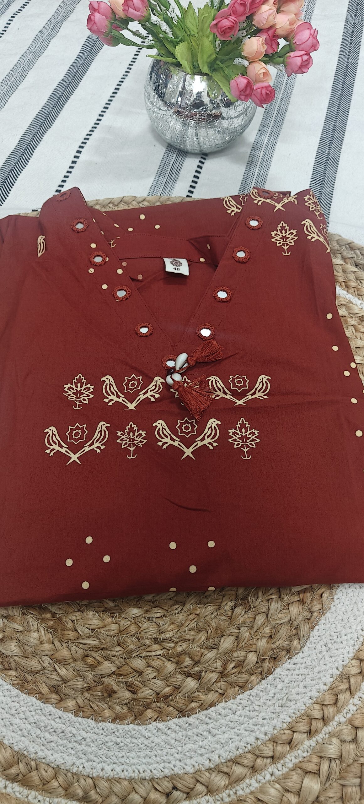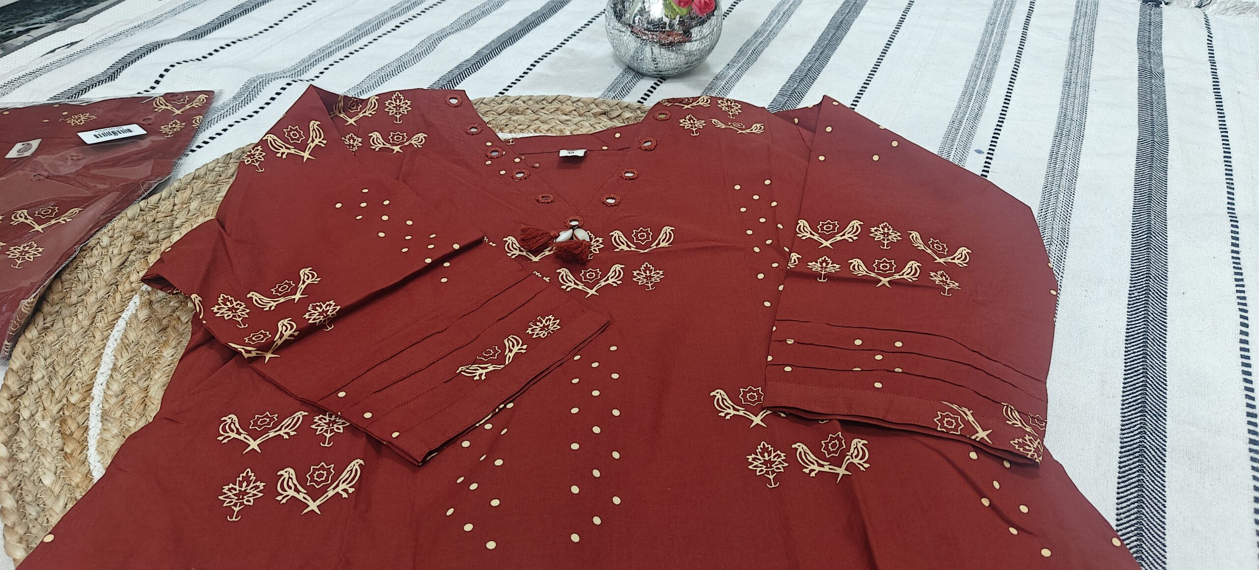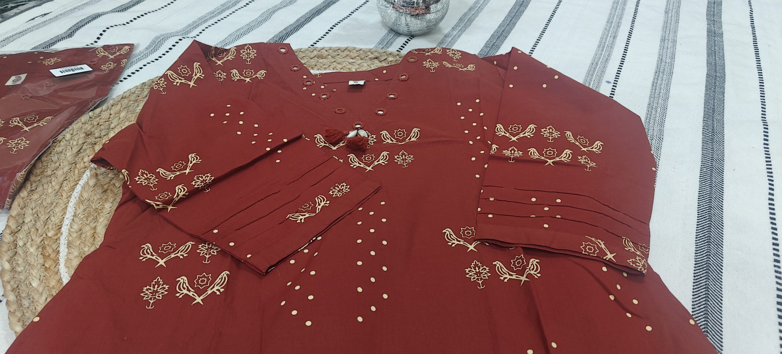 Add a touch of earthy elegance to your wardrobe with this beautiful rust-colored A-line kurta, featuring delicate traditional prints in subtle golden tones. The minimal yet eye-catching motifs are perfectly balanced with a stylish tie-up neckline and soft pleated detailing on the yoke.